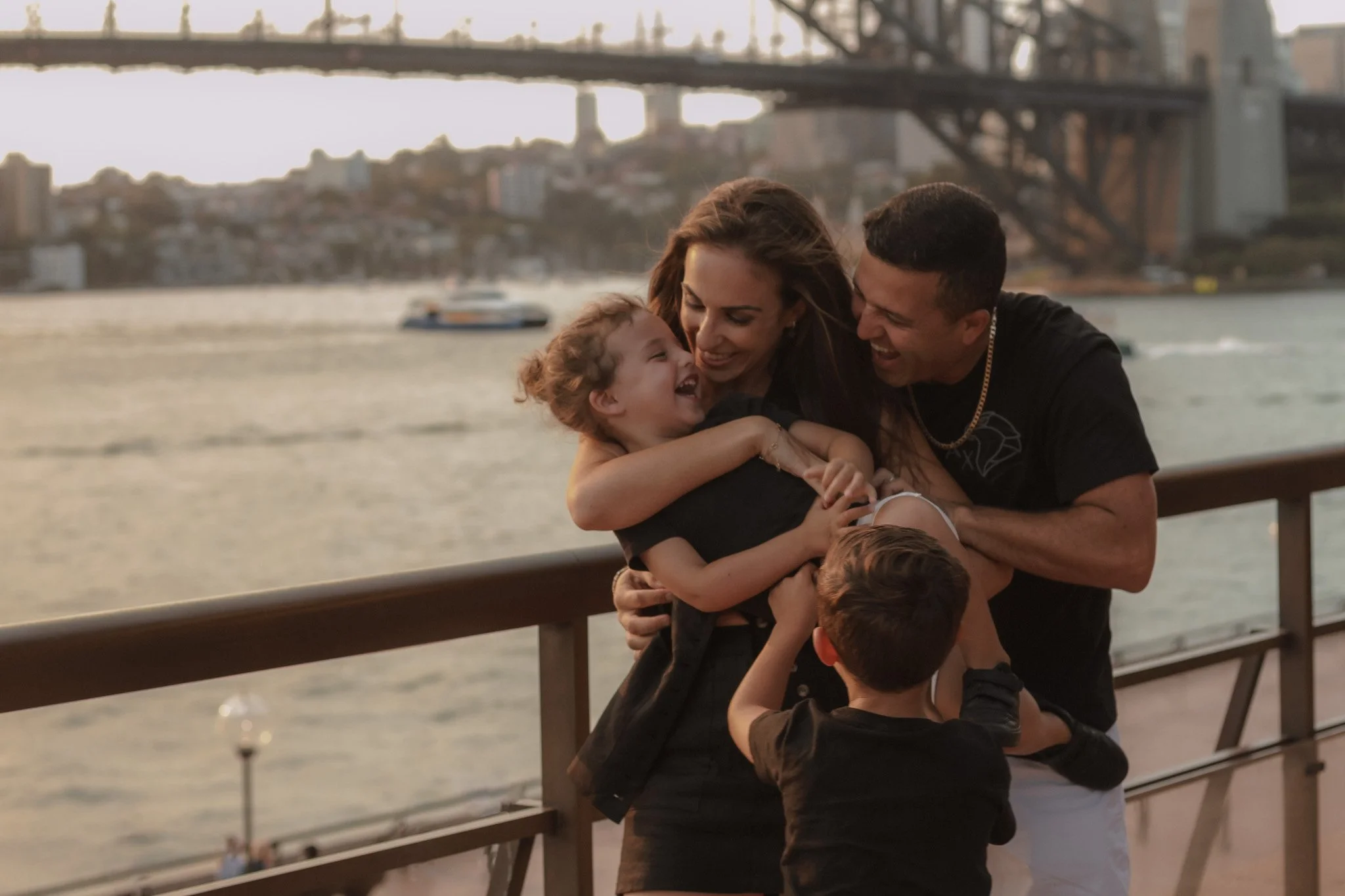 A black and white family portrait captured at Sydney Coogee Beach, showcasing a family of three enjoying a relaxed newborn moment. This image exemplifies the natural style of candid family photography in Sydney.