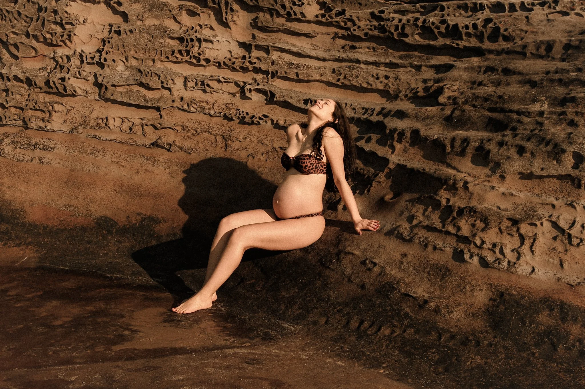 A candid maternity photoshoot captured in a tranquil Little Bay Beach, showcasing a mother-to-be enveloped in soft, earthy tones that echo the natural surroundings. The golden sunlight of late afternoon bathes the scene, highlighting her gentle smile